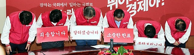 [=연합뉴스 기자]새누리당 김무성 대표를 비롯한 공동선대위원장들이 7일 오전 서울 여의도 당사에서 열린 긴급 중앙선거대책위원회 회의에서 “죄송합니다 잘하겠습니다 소중한 한 표 부탁드립니다”라는 팻말을 들고 고개숙여 인사하고 있다. 왼쪽부터 안형환 선대위 대변인, 원유철·김무성·서청원 공동선대위원장, 이군현 선대위 총괄본부장, 이운룡 선대위 종합상황실장.