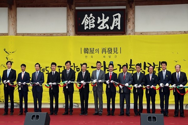 | 제5회 대한민국 한옥건축박람회 개막식 테이프 컷팅 행사에 참석한 내외 귀빈과 전동평 영암군수(사진, 우6) 이하남 영암군의회의장(우5) | ||