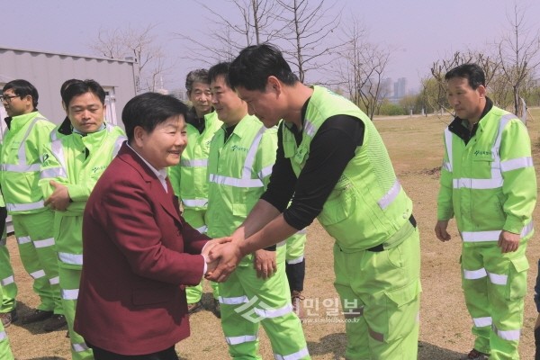 | ▲ 박정자 서울 영등포구의장이 영등포 여의도 봄꽃축제 청소상황실의 근무자들을 격려하고 있다. | ||