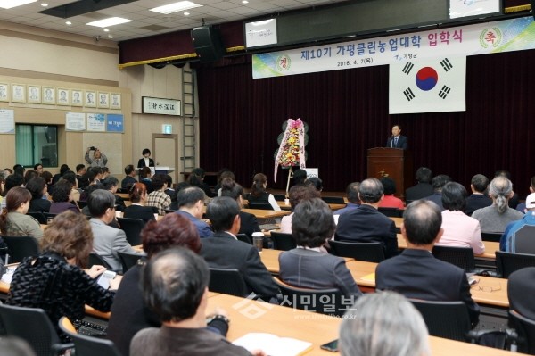 최근 경기 가평군은 농업기술센터 대강당에서 각급기관 단체장, 농업경영인, 가족 등 200여명이 참석한 가운데 제10기 가평클린농업대학 입학식을 개최했다. 사진은 김성기 군수가 축사하고 있는 모습.(사진제공=가평군청)