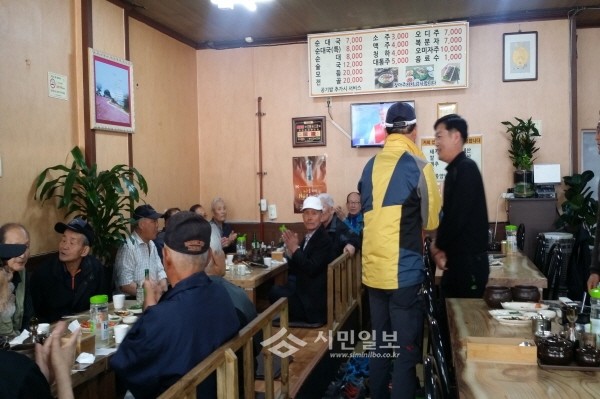 최근 경기 동두천시 중앙동 소재‘황돈 순대국’에서 지역 노인 20명을 초청해 사랑의 중식봉사활동을 실시했다. 사진은 행사에 참석한 노인들의 모습.(사진제공=동두천시청)