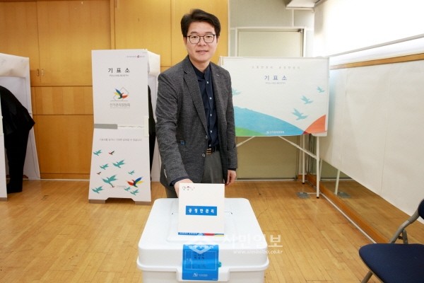 정원오 서울 성동구청장은 제20대 국회의원 선거 사전투표 첫째날인 지난 8일 오전 행당1동 주민센터 사전투표소를 방문해 투표를 실시했다. 사진은 정 구청장이 투표하는 모습.(사진제공=성동구청)