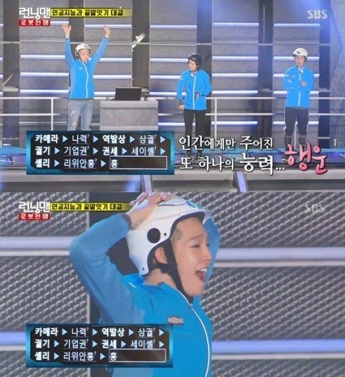 이날 '런닝맨' 멤버들과 게스트들은 인공지능 로봇 '제이봇'과 끝말잇기 대결을 했다. '셸'이라는 단어가 등장하자 당황한 송민호는 "저격찬스. 남태현!"이라고 외쳤다.
