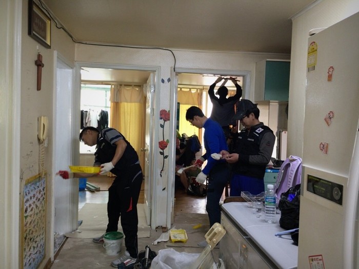 지난 10일 충남 아산시 신창면 행복키움추진단은 읍내자율방범대와 연계해 지역내 저소득 한부모 가정에 주거환경 개선사업의 일환으로 페인트칠 작업 및 노후된 전등 교체와 화장실 개보수를 실시했다. 사진은 봉사자들이 페인트칠을 하는 모습.(사진제공=아산시청)