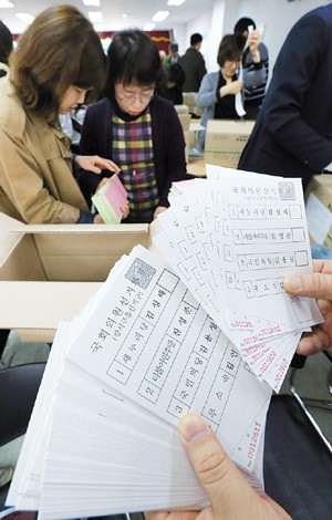 20대 총선을 이틀 앞둔 11일 오후 서울 가양동 강서구선거관리위원회에서 각 투표소 관리관들이 투표 용지 배송에 앞서 최종 검수를 하고 있다.