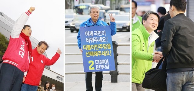 김무성 새누리당 대표가 11일 오후 자신의 지역구인 부산 중구 국제시장에서 어묵과 비빔당면 맛보다 외손자에게 어묵을 먹여주고 있다(왼쪽). 더불어민주당 김종인 비상대책위 대표가 11일 오전 서울 강남구 선릉역 사거리에서 피켓을 목에 걸고 투표참여 캠페인을 하고 있다(가운데). 국민의당 안철수 공동대표가 11일 오전 인천 부평역에서 출근길 시민에게 인사하며 지지를 호소하고 있다.