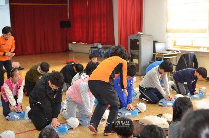 최근 서울 강남소방서는 일원동 대청초등학교에서 5~6학년 학생 60여명을 대상으로 심폐소생술 교육을 실시했다. 사진은 학생들이 심폐소생술 실습을 하는 모습.(사진제공=강남소방서)
