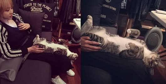사진 속 나르샤는 자신의 애완묘를 무릎에 눕혀두고 따듯한 눈빛으로 그를 보고 있다.