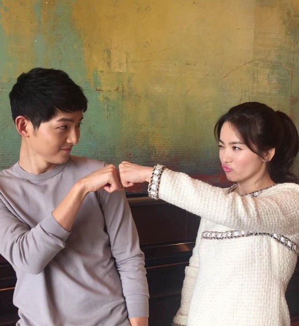 공개된 사진 속에는 송혜교와 송중기가 서로를 바라보며 주먹을 맞대고있는 모습이 담겨있다.