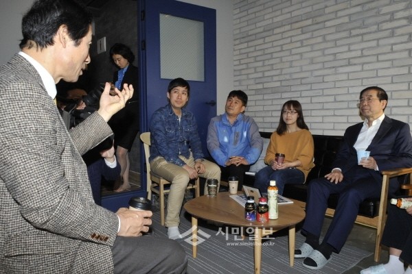 지난 11일 박원순 서울시장(오른쪽)과 문석진 서울 서대문구청장(왼쪽)이 연희동 '빈집 살리기' 프로젝트 현장을 방문해 입주자들과 대화를 나누고 있다. 빈집 살리기는 재개발이나 재건축 사업이 늦어져 폐허가 된 빈집을 고쳐 저렴한 임대주택으로 공급하는 프로젝트다.(사진=서대문구청)