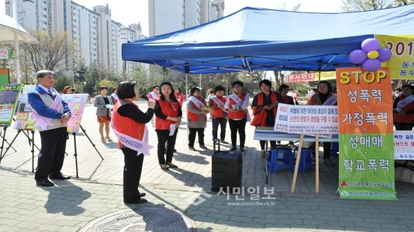 최근 경기 동두천시는 송내동 시민공원에서 폭력에 대한 예방과 사회적 경각심을 높이고자 성폭력·가정폭력·성희롱·성매매·학교폭력예방 합동캠페인을 실시했다. 사진은 오세창 시장(맨 왼쪽)을 비롯한 관계자들이 캠페인을 진행하는 모습.(사진제공=동두천시청)