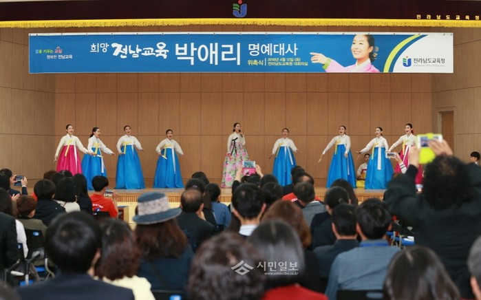 지난 12일 전남교육청은 대회의실에서 목포혜인여고 출신 박애리 국악 명창에게 '희망 전남교육 명예대사 위촉패'를 수여했다. 사진은 이날 행사에서 박애리 명창(가운데)이 진도국악고등학교 학생들과 협연하는 모습.(사진제공=전남교육청)