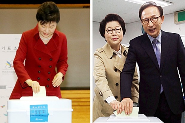 박근혜 대통령이 13일 오전 서울 종로구 청운효자동 제1투표소에서 제20대 국회의원 총선거 투표를 하고 있다. 이명박 전 대통령 내외도 같은 날 서울 강남구 논현1동 제3투표소에서 제20대 국회의원 총선거 투표를 하고 있다.