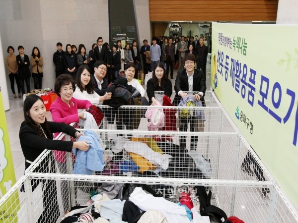 지난 11일 서울 송파구는 구청 로비에 구청 전직원이 참여한 가운데 재활용 수거 박스를 설치하고 불우이웃을 돕기 위한 헌옷류 등 자원재활용품 모으기 행사를 개최했다. 사진은 박춘희 구청장(왼쪽에서 두번째)과 관계자들이 기념촬영을 하는 모습.(사진제공=송파구청)