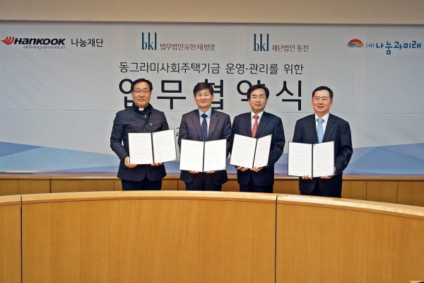 이번 업무협약에 따라 한국타이어나눔재단은 30억원의 기금을 출연하고 나눔과미래는 ‘동그라미 사회주택기금’을 운영하며 태평양과 동천은 운영에 필요한 법률자문을 맡는 등 상호 협력해 사업을 진행할 계획이다.