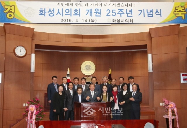 [화성=김정수 기자]경기 화성시의회는 박종선 의장을 비롯한 18명의 의원들과 채인석 시장 및 집행부 간부 공무원들이 참석한 가운데 14일 의회 본회의장에서 의회개원 제25주년 기념행사를 열었다.