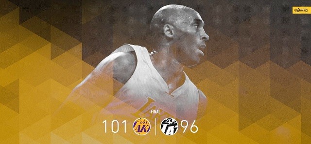 LA 레이커스는 14일(한국 시각) 미국 캘리포니아주 로스엔젤레스 스테이플스센터에서 열린 2015-2016 NBA 유타 재즈와 원정 경기에서 101-96으로 역전승을 거뒀다. LA 레이커스는 막판까지 유타와 시소게임을 이어갔지만 경기 종료 31초를 남기고 코비의 연속 4득점이 터지며 역전에 성공했다.