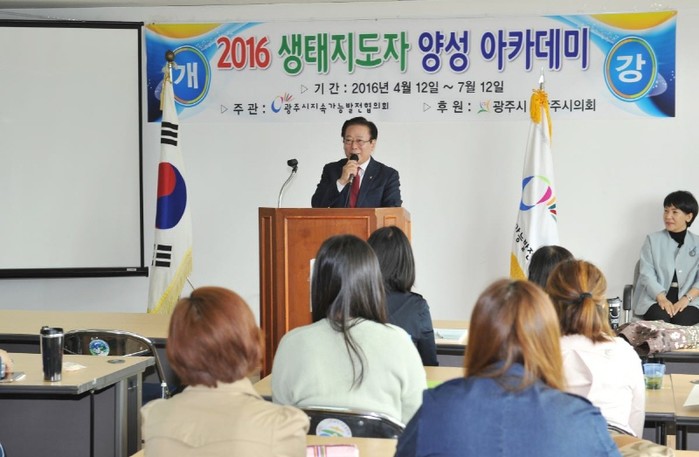 최근 경기 광주시지속가능발전협의회는 협의회 사무국 교육실에서 오는 7월12일까지 운영되는 시 생태계에 대한 올바른 이해와 실천 활동을 위한 '2016 생태지도자 양성아카데미' 개강식을 개최했다. 사진은 조억동 시장이 축사하는 모습.(사진제공=광주시청)