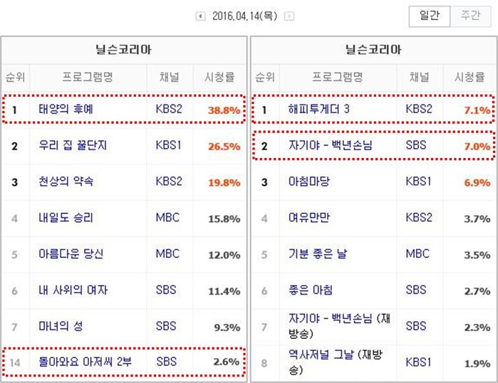 이 수치는 목요일 예능 직전에 방송된 KBS ‘태양의 후예(16회)’와 SBS '돌아와요 아저씨(16회)‘의 시청률이다. 단순 비교시 ’해피투게더‘는 ’백년손님‘보다 15배 높은 시청률이 나와야 정상이지만, 이 날의 시청률 차이는 고작 0.1%에 불과했다. 종합적으로 분석해 보면, ’백년손님‘에 대한 시청자들의 충성도가 어느 정도인지를 역설적으로 가늠할 수 있다.