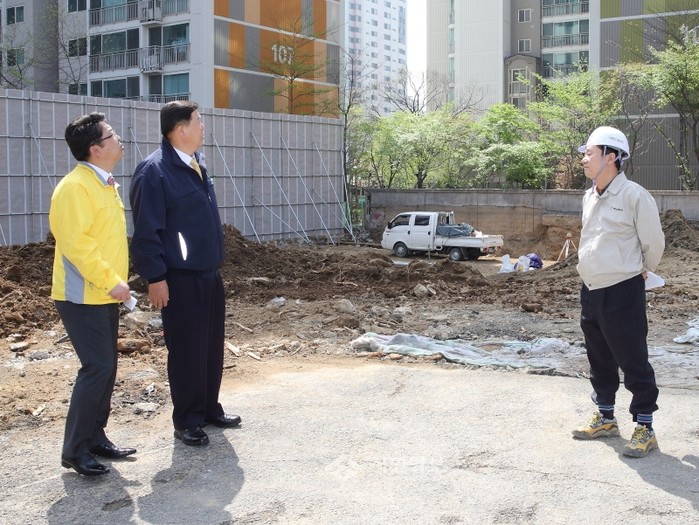 조길형 서울 영등포구청장(가운데)이 최근 찾아가는 현장행정의 일환으로 당산동내에 경찰악대청사 신축공사현장을 방문해 공사 진행 사항을 살피고 있다.(사진제공=영등포구청)