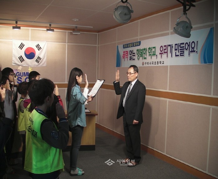 지난 14일 경북 구미사곡초에서 전교 학생회 및 학급회 임원들이 모여 2016학년도 구미사곡초 자치순찰대 발대식을 진행했다. 사진은 학생들이 선서하는 모습.(사진제공=구미교육지원청)
