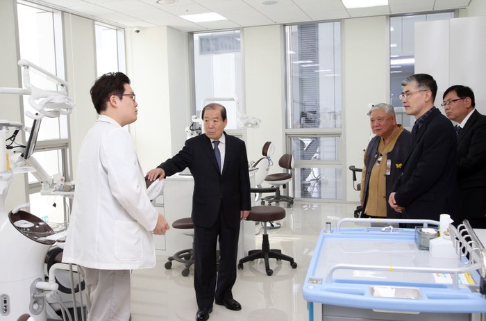 박홍섭 서울 마포구청장(왼쪽 두번째)이 시범운영 중인 상암동의 푸르메재단 넥슨어린이재활병원을 최근 방문해 장애아동 재활치료 시설인 치과 진료실을 둘러보고 있다.(사진제공=마포구청)
