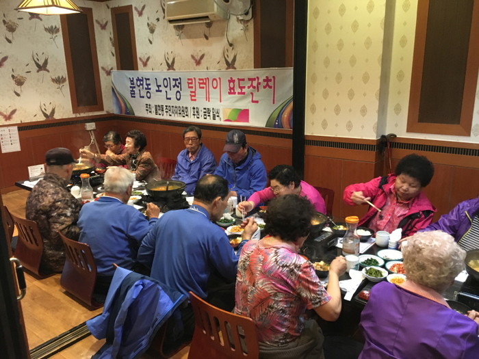 최근 경기 동두천시 불현동 주민센터는 생연동 소재 금락일식에서 불현 20통, 지행주공 2단지 경로당 노인 25명을 초청해 릴레이 효도잔치를 개최했다. 사진은 행사에 참석한 노인들이 식사하는 모습.(사진제공=동두천시청)