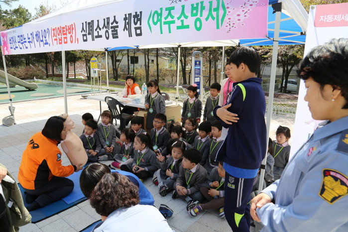 지난 15일 경기 여주시 여주소방서가 여주근린공원에서 시 보건소 주최로 열린 ‘벚꽃과 함께하는 시민건강축제’에 참석해 ‘119안전체험장’을 운영했다. 사진은 아이들에게 모형인형으로 심폐소생술 교육을 하고있는 여주소방서 관계자의 모습.(사진제공=여주소방서)