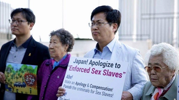 유엔 본부 앞에서 위안부 권리회복을 위한 시위 중인 최성시장