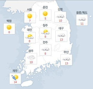 오늘 오전 최저기온 서울 7도, 대전 7도, 광주 9도, 대구 9도, 부산 12도로 시작해 오후 최고기온 서울 17도, 대전 19도, 광주 19도, 대구 21도, 부산 20도까지 오르겠다. 어제보다 2도에서 많게는 5도가량 높을 것으로 보인다.