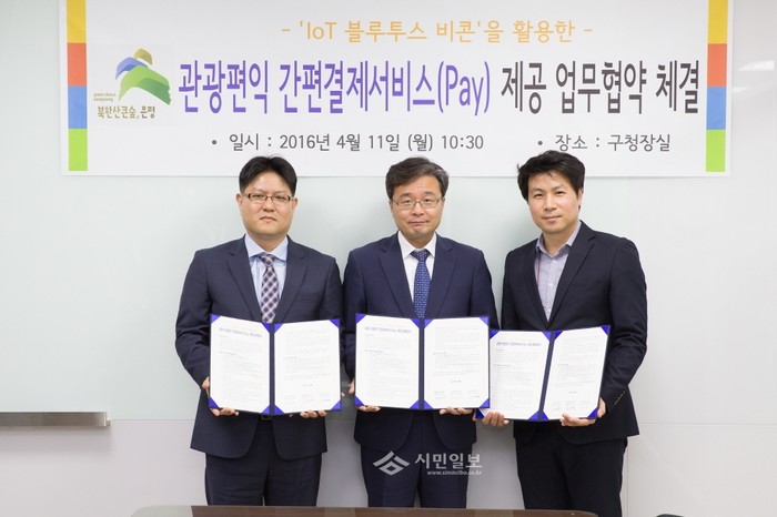 최근 은평구는 (주)모아정보기술, (주)넥스트페이지와 지역관광 및 상권을 활성화하기 위해 'IoT 블루투스 비콘을 활용한 관광편익 간편결제서비스(pay) 제공 업무협약'을 체결했다. 사진은 김우영 구청장(가운데)과 관계자들이 기념촬영하는 모습.(사진제공=은평구청)