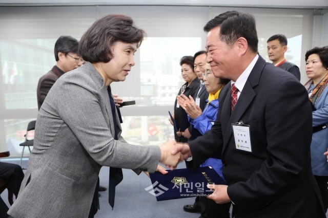 | 관악구의회 제25주년 개원기념식에서 이성심 의장(왼쪽)이 공로가 많은 주민에게 감사장을 전달하고 있다.(사진제공=관악구의회) | ||