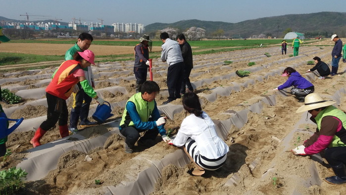 지난 15일 경기 수원시 권선구 입북동 효사랑 장수지팡이 만들기 사업단은 사업단 및 각 단체원 30명이 참여한 가운데 당수동 시민농장 농지 1800㎡에 명아주를 식재했다. 사진은 관계자들이 명아주를 심는 모습.(사진제공=권선구청)