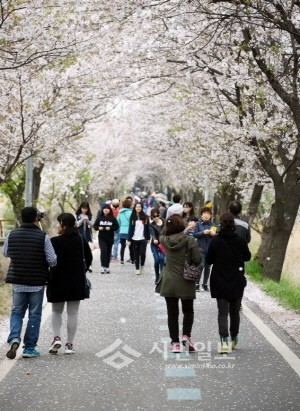 최근 경기 김포시의 계양천 산책로 주변 봄꽃현장에서 개최된 ‘2016 김포1동 봄꽃축제’에서 축제에 방문한 주민들이 벚꽃잎이 흩날리는 거리를 거닐며 봄의 정취를 즐기고 있다.(사진제공=김포시청)