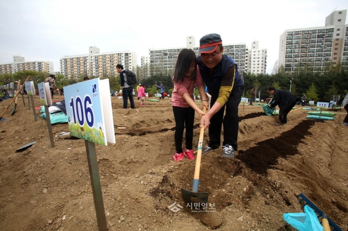 지난 16일 서울 강남구는 수서동에서 '2016년 강남구 친환경 도시텃밭 개장식'을 개최했다. 사진은 행사에 참석한 분양자 가족이 텃밭을 일구고 있는 모습.(사진제공=강남구청)