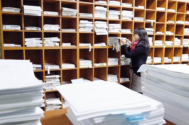 여야 3당 원내지도부의 합의로 19대 국회의 마지막 임시국회가 21일부터 소집되지만, 계류 법안들을 논의할 상임위원회가 대부분 공전하면서 ‘빈손’으로 끝날 가능성이 커지고 있다. 19대 국회는 현재 의원발의가 1만6664건으로 이 중 41.5%를 가결돼 법안 처리율이 절반도 안 되고 있다. 사진은 19일 19대 국회에서 처리하지 못한 법안들이 한 국회 상임위원회 앞에 쌓여 있는 모습.