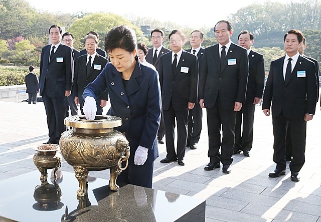 박근혜 대통령이 제56주년 4.19혁명 기념일인 19일 오전 서울 강북구 수유동 국립 4.19 민주묘지를 방문, 기념탑에 분향하고 있다.