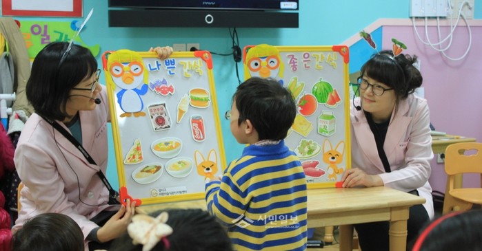 | ▲ 강서구 어린이급식관리지원센터에서 방문 교육을 통해 어린이들에게 식생활 교육을 진행하고 있다. | ||