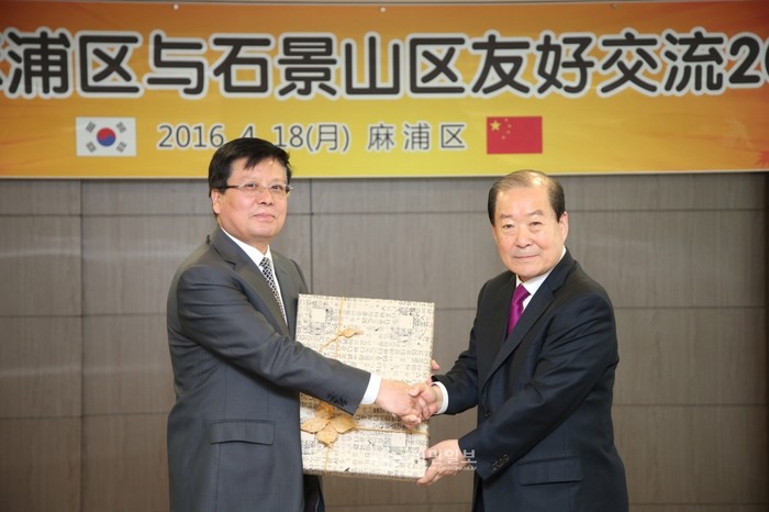 최근 중국 베이징시 석경산구 대표단이 '우호교류 20주년'을 기념해 마포구를 방문한 가운데 구청에서 박홍섭 마포구청장(오른쪽)과 웨더순 석경산구 구의장이 상호 기관선물을 전달하고 기념촬영하고 있다.(사진제공=마포구청)