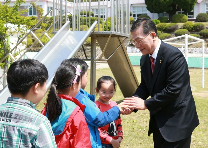 지난 19일 장만채 전남도교육감은 여수 거문도를 방문해 학생, 교직원, 학부모 등과 대화를 하고, 거문도 지역 교육발전 방향에 대한 의견을 들었다. 사진은 장 교육감이 학생들과 이야기를 나누는 모습.(사진제공=전남도교육청)