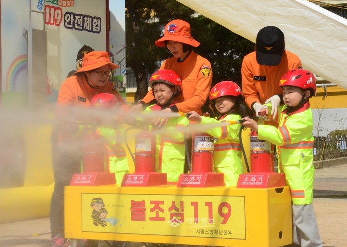 지난 19일 서울 영등포소방서는 여의도동 소재 윤중초 병설유치원에서 어린이들을 대상으로 '찾아가는 소방안전체험 교실'을 운영했다. 사진은 교육에 참가한 어린이들이 소화기 사용 실습을 하는 모습.(사진제공=영등포소방서)