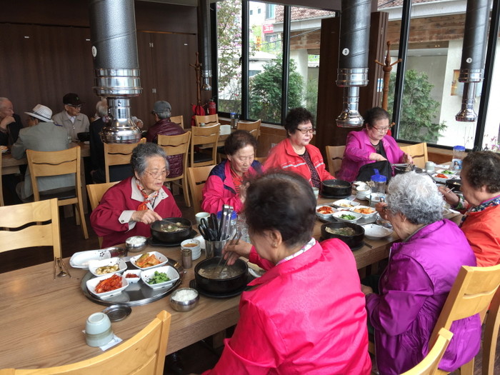 지난 20일 경기 동두천시 생연2동에 위치한 동동갈비는 지역내 부영아파트 5단지 경로당 노인 15명을 초청해 갈비탕을 제공했다. 사진은 행사에 참석한 노인들이 식사 하는 모습.(사진제공=동두천시청)