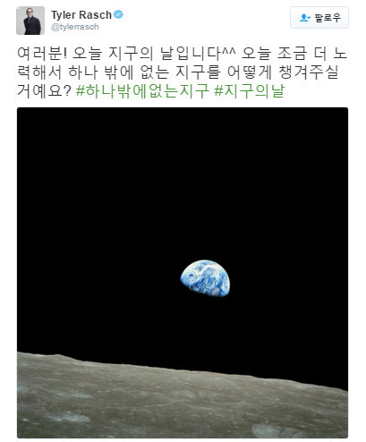 타일러 라쉬는 최근 자신의 SNS에 "여러분! 오늘 지구의 날입니다^^ 오늘 조금 더 노력해서 하나 밖에 없는 지구를 어떻게 챙겨주실 거예요?"라는 문장과 함께 사진을 게시했다.
