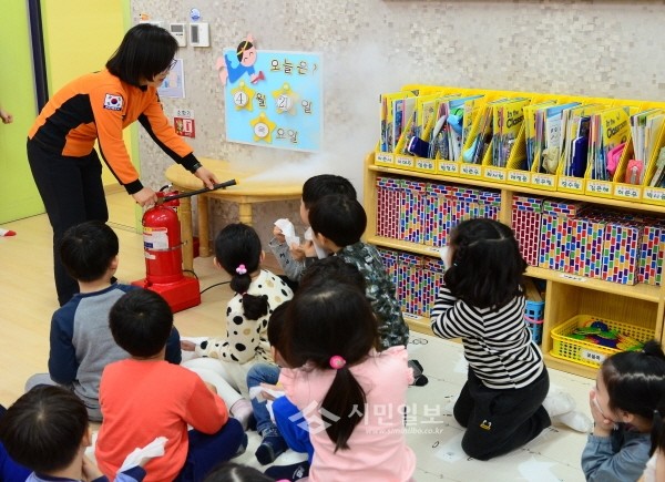 지난 21일 서울 영등포소방서는 문래동 소재 청소년수련관에서 보육교사와 어린이들을 대상으로 소화기 사용법, 화재발생시 행동요령과 연기탈출 체험 등 맞춤형 소방안전교육을 실시했다. 사진은 소방관이 어린이들에게 소화기 사용법을 가르치는 모습.(사진제공=영등포소방서)
