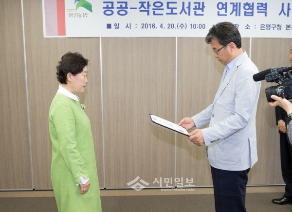 최근 서울 은평구는 작은도서관의 발전과 공공도서관과의 연계 강화 도모를 위한 명예도서관장 위촉 및 공공-작은도서관 연계협력 사업설명회를 개최했다. 사진은 김우영 구청장(오른쪽)이 최명숙 명예도서관장에게 위촉장을 수여하는 모습.(사진제공=은평구청)