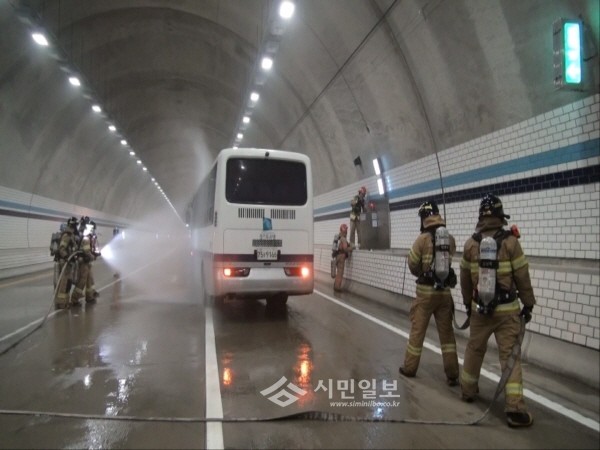 최근 경기 군포소방서는 오는 29일 개통을 앞둔 수도권서부고속도로(수원~광명)의 수리산1터널에서 현장대응훈련을 실시했다. 사진은 소방관들이 차량화재 진압훈련을 진행하는 모습.(사진제공=군포소방서)