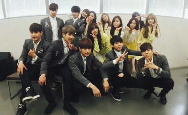 러블리즈와 인피니트는 사진 속에서 상큼한 미소와 귀여운 포즈를 취하고있다. 같은 소속사에 속한 두 그룹의 훈훈한 모습이 돋보인다.