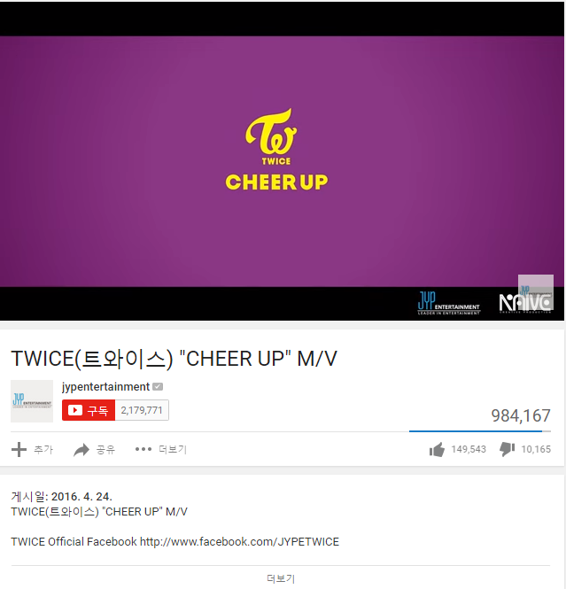 | ▲트와이스 치어 업 뮤비 공식 유튜브 페이지 | ||