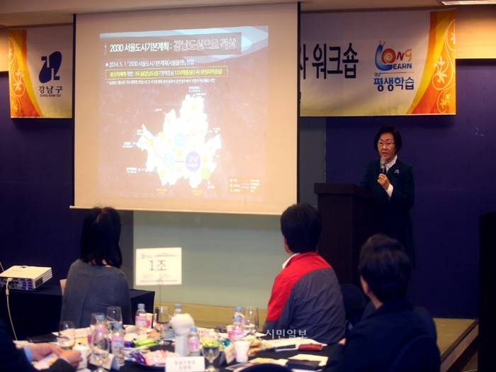 강남구는 최근 경기 가평 켄싱턴리조트에서 '2016 평생교육기관장 및 실무자 워크숍'을 개최했다. 사진은 행사에 참석한 신연희 구청장이 인사말을 하는 모습.(사진제공=강남구청)