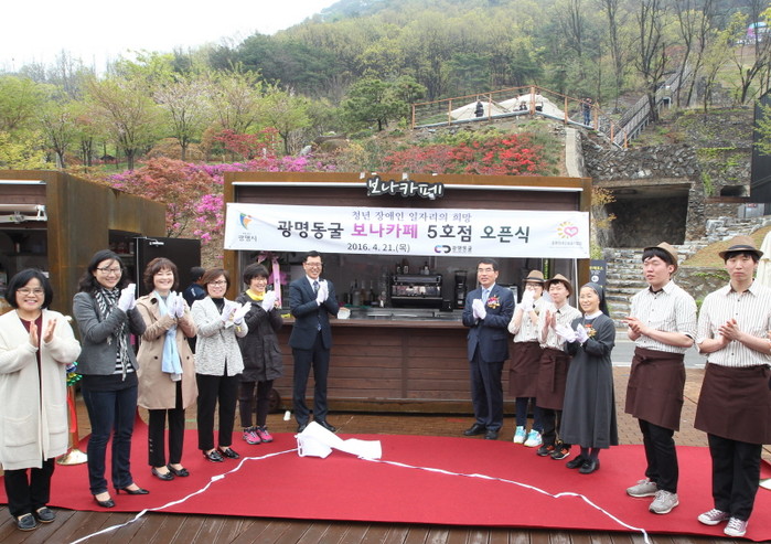 최근 경기 광명시는 장애인들의 일자리 창출을 위해 광명동굴에 보나카페 5호점을 개점했다. 사진은 양기대 광명시장(오른쪽에서 여섯 번 째)등 관계자들이 개점 테이프를 절단하고 박수를 치고 있다.(사진제공=광명시청)